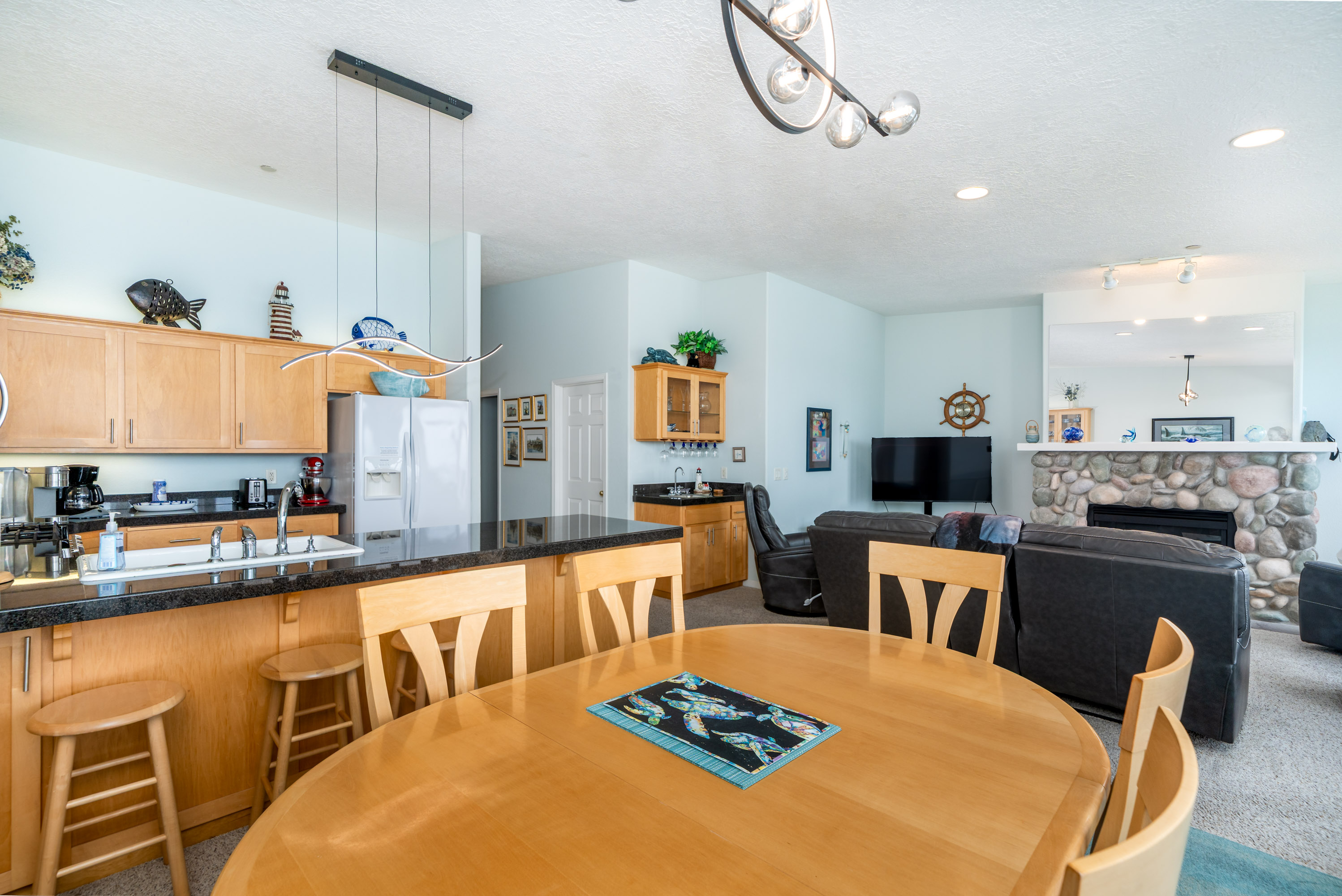 Your living room includes a magnificent river rock fireplace, comfy sofa, and room to relax and take in the views. Watch a movie or game on the large hi-definition television with HD cable. You also have a Blu-Ray DVD, games, and puzzles at your disposal.