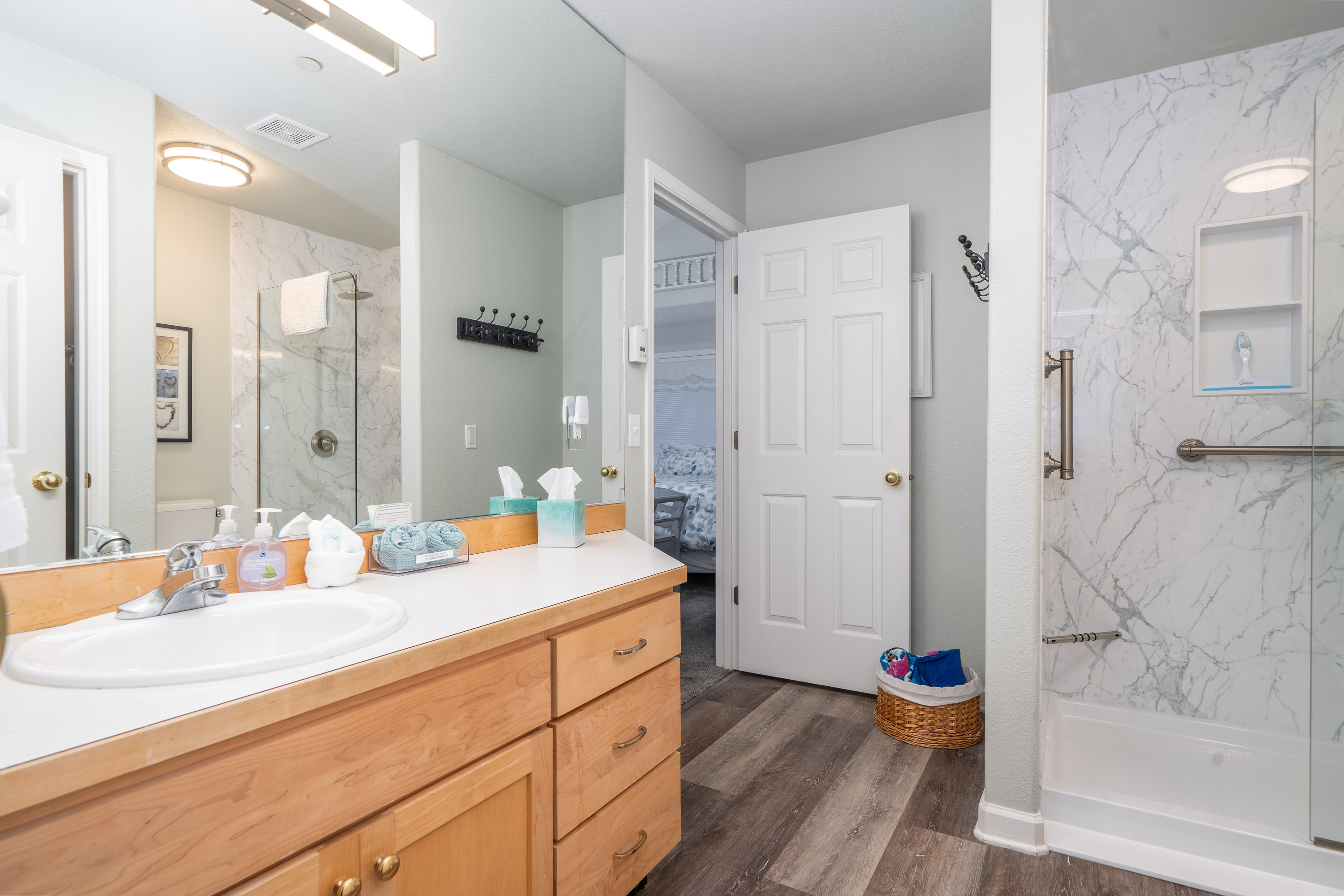 The master bedroom features a king bed for rest and relaxation and also has high ceilings for a spacious feeling. The master bathroom has a walk-in shower.